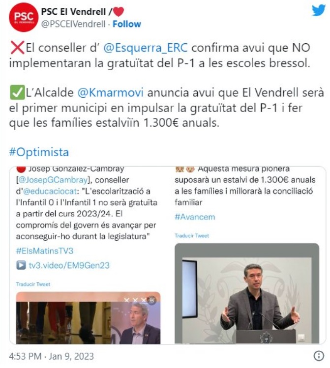 El Vendrell serà el primer municipi en impulsar la gratuïtat del I-1 (P1) a les escoles Bressol. Primer municipi!…i sembla ser que l’únic municipi a tota Catalunya. Que totes les famílies (sense distinció de renda) puguin portar al seu infant a l’escola bressol, és una bona notícia per les famílies, per als infants i per avançar cap una educació complerta (a partir dels 0 anys), gratuïta i universal. Olé el Vendrell!