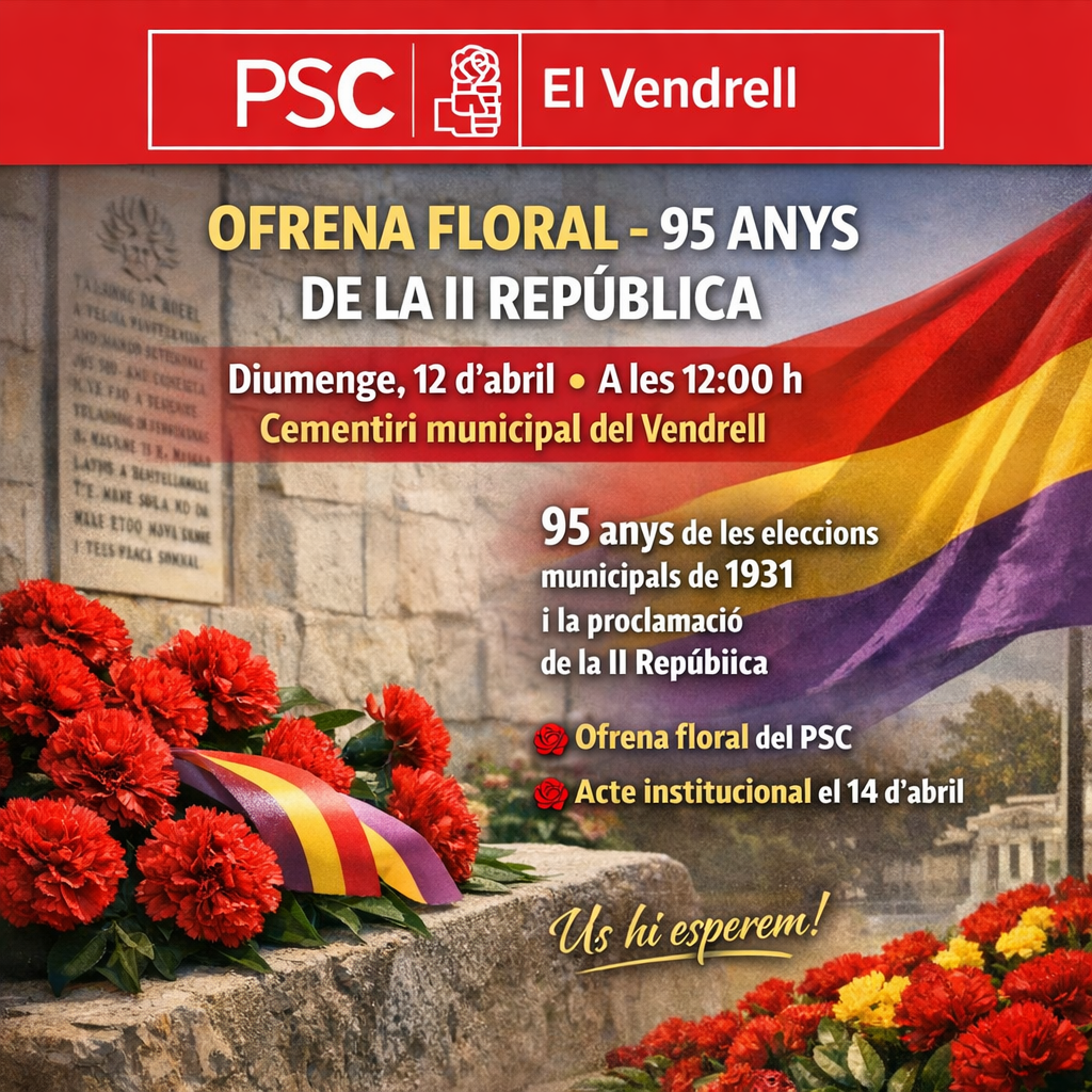 Per tal motiu, us convoquem el proper diumenge 12 d’abril a participar a l’ofrena floral que el PSC celebrarà al cementiri municipal del Vendrell a les 12h i a l’acte institucional de l’Ajuntament que tindrà lloc el proper 14 d’abril al matí.
